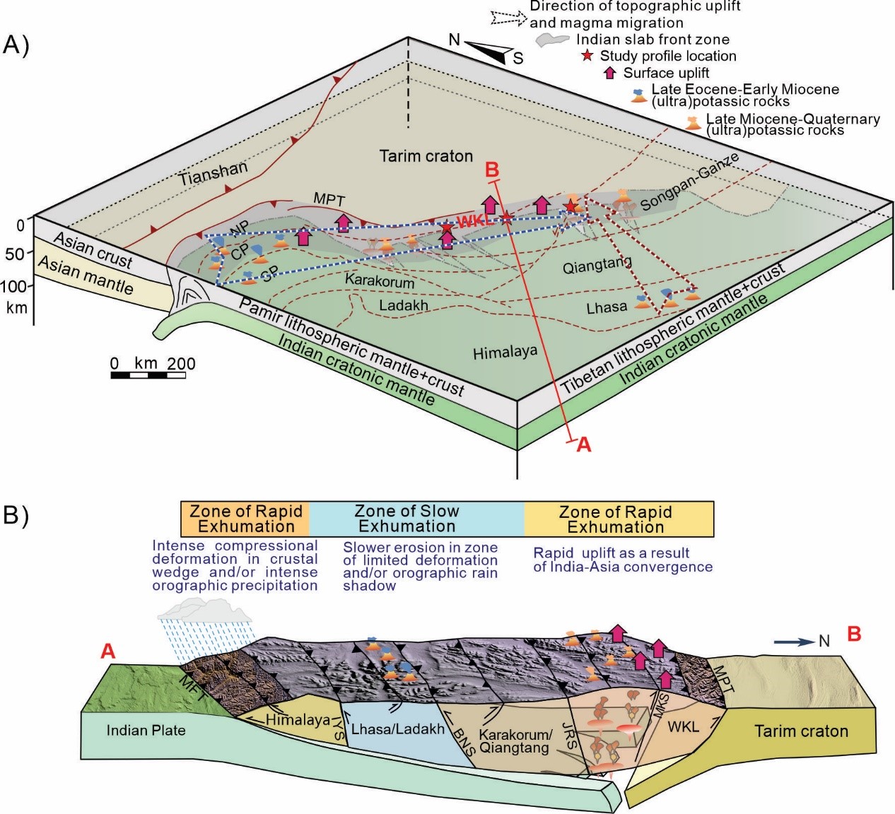 The study shows that the rapid uplift around 11–10 Ma corresponds to the initial "hard collision" between the Indian and Tarim plates. This event led to a significant slowdown and stabilization of the India-Eurasia plate convergence rate after ~11 Ma. It also triggered (ultra-)potassic magmatism in the West Kunlun region by ≤10 Ma and a widespread uplift response recorded around ~11 Ma across the Tibetan Plateau and surrounding orogens (e.g., Tianshan). Notably, since the Oligocene, cooling ages and (ultra-)potassic magmatism ages show a trend of becoming younger from the interior of the plateau (Qiangtang-Lhasa terranes) towards the West Kunlun. This spatiotemporal pattern is controlled by the deep dynamic process of the continuous northward indentation of the Indian plate into Asia. The subduction, collision, and subsequent tearing of the Indian slab collectively regulate the "outward growth" of the plateau and "magma migration." The research findings have been published in Geology.